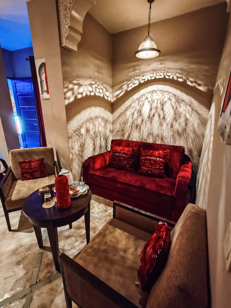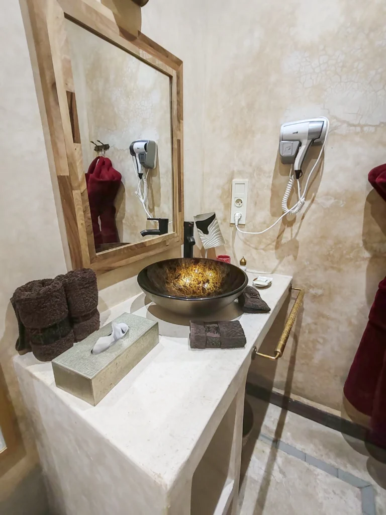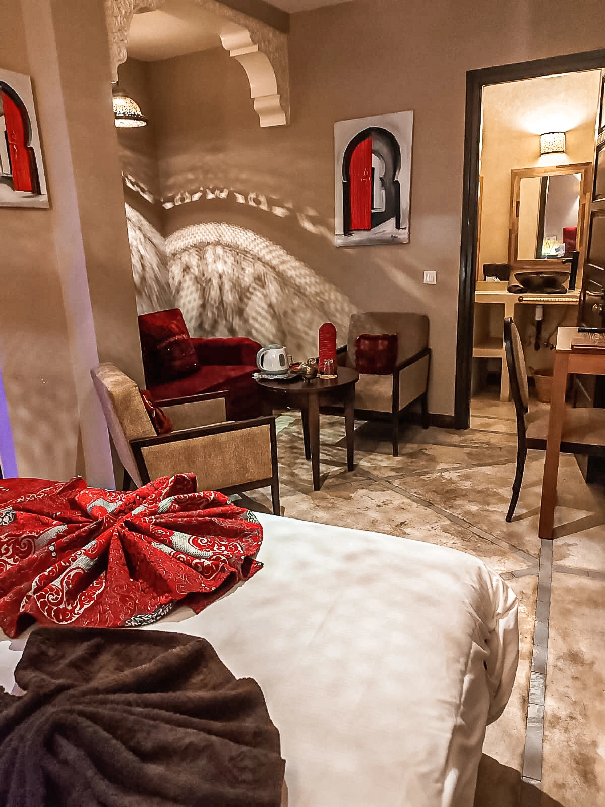 La camera Rubino offre uno spazio generoso pensato per accogliere fino a tre persone in un comfort ottimale. La sua atmosfera elegante e la sua decorazione raffinata creano un ambiente armonioso, ideale per un soggiorno in famiglia o tra amici. Questa camera dispone di attrezzature moderne, biancheria confortevole e un bagno curato, offrendo così un'atmosfera calda e rilassante. Uno spazio piacevole che garantisce un'esperienza rilassante e conviviale nel cuore del Riad.
