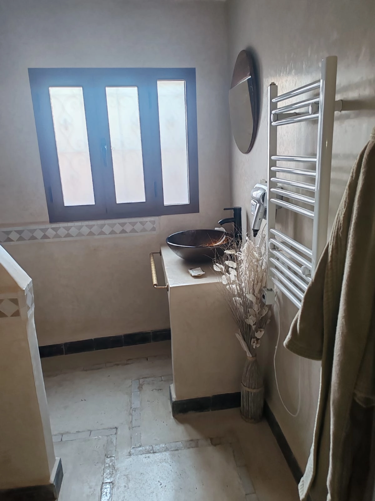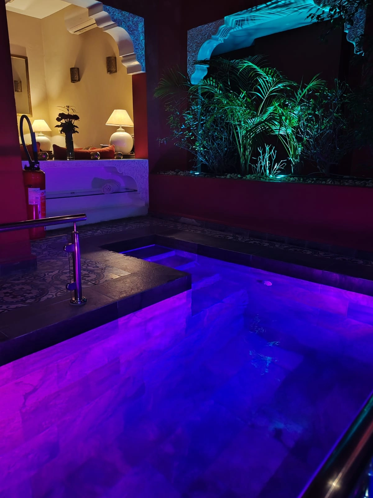 Dans le patio, vous profiterez de l’élégant salon marocain ou vous plongerez dans le bassin, rafraîchissant l’été et chauffé pour votre confort l’hiver.