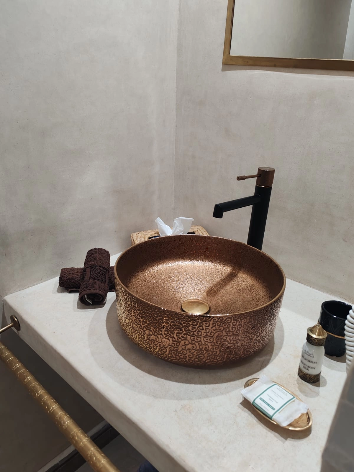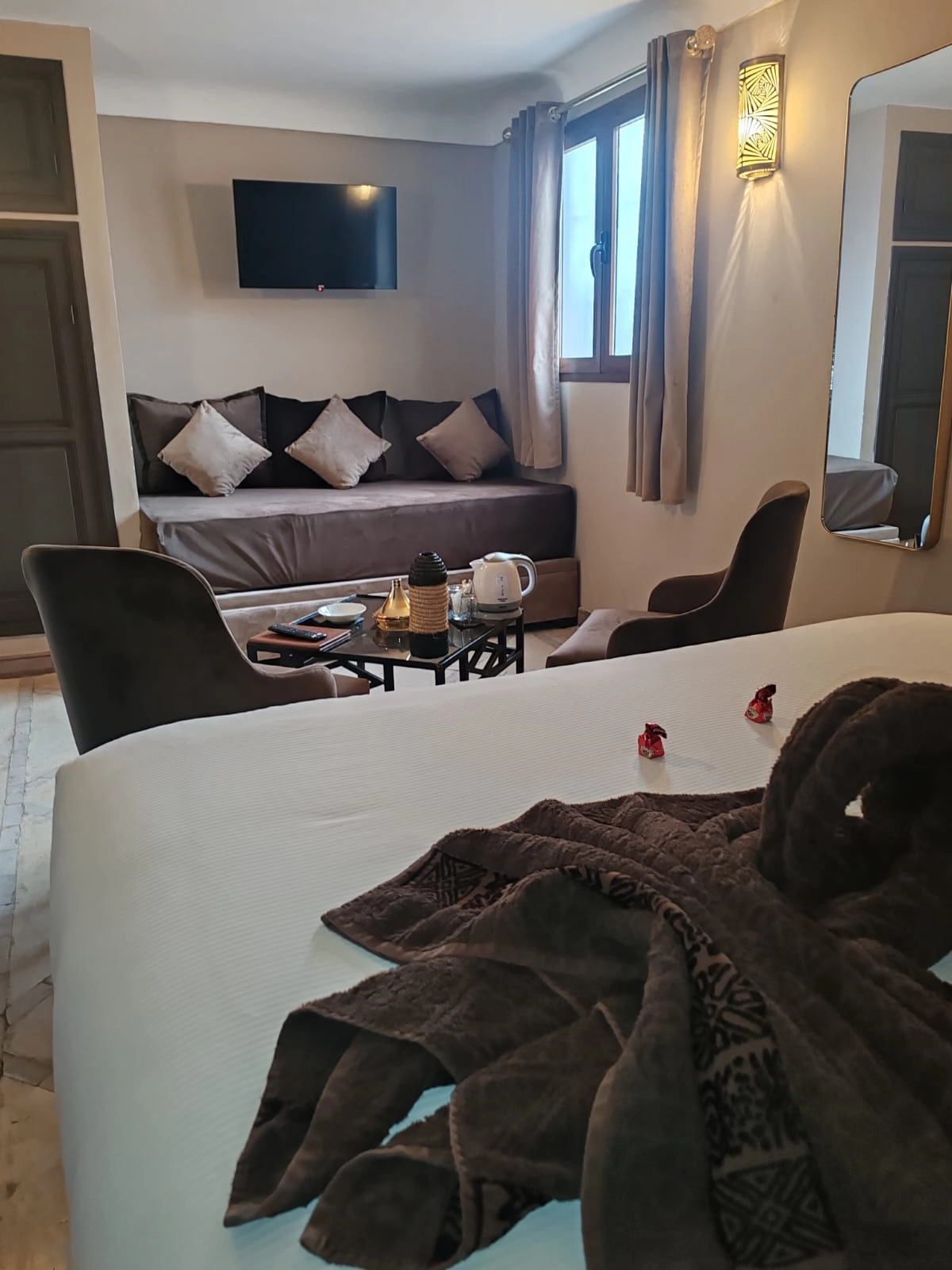 La chambre Ambre, de catégorie supérieure, séduit par sa luminosité et son décor naturel à la fois élégant et apaisant. Pensée pour offrir un séjour reposant, elle se distingue par son agencement soigné, ses matières harmonieuses et son ambiance paisible qui invitent à la détente dès l’entrée. Cette chambre dispose d’une literie confortable, d’une salle de bain moderne et d’un espace privé agréable, offrant ainsi le niveau de confort idéal pour profiter pleinement de l’expérience authentique et chaleureuse du Riad.