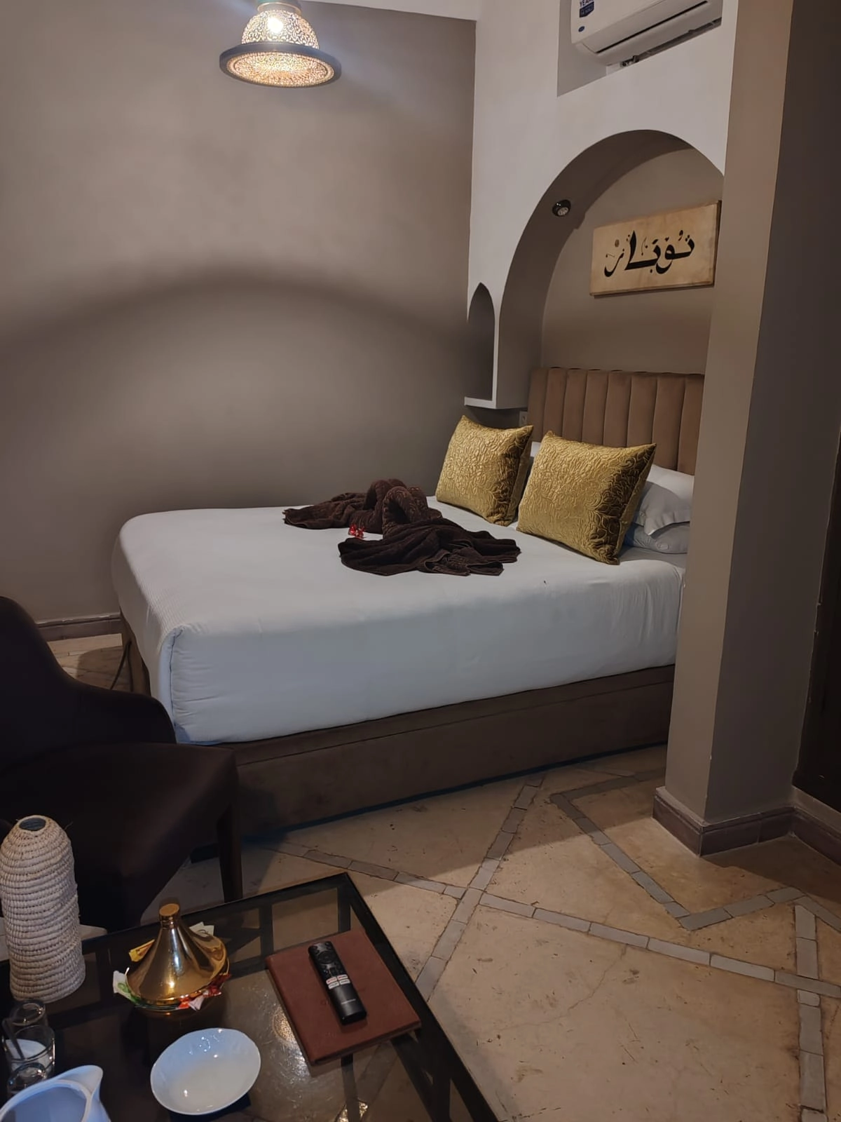La chambre Topaze séduit par son atmosphère chaleureuse et son décor traditionnel revisité avec finesse. Pensée pour accueillir deux personnes, elle offre un cadre intime et apaisant, idéal pour se ressourcer en toute tranquillité. Ses finitions soignées, sa lumière douce et son ambiance paisible créent un environnement propice au repos. Cette chambre dispose d’une literie confortable, d’une salle de bain moderne et d’un espace privé harmonieux, faisant de Topaze un choix privilégié pour les voyageurs en quête de confort et de douceur de vivre.
